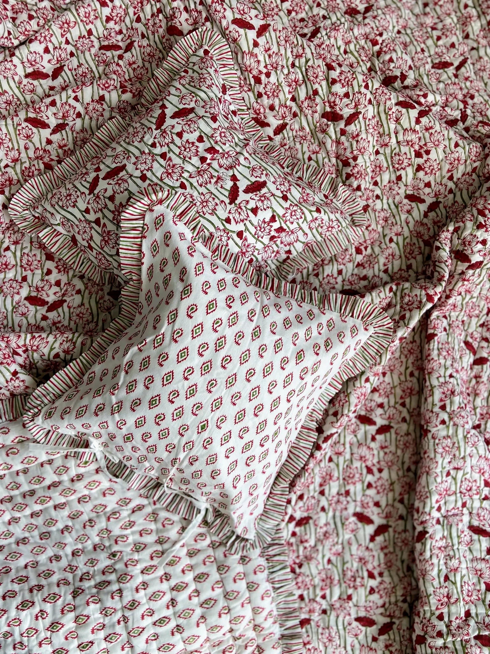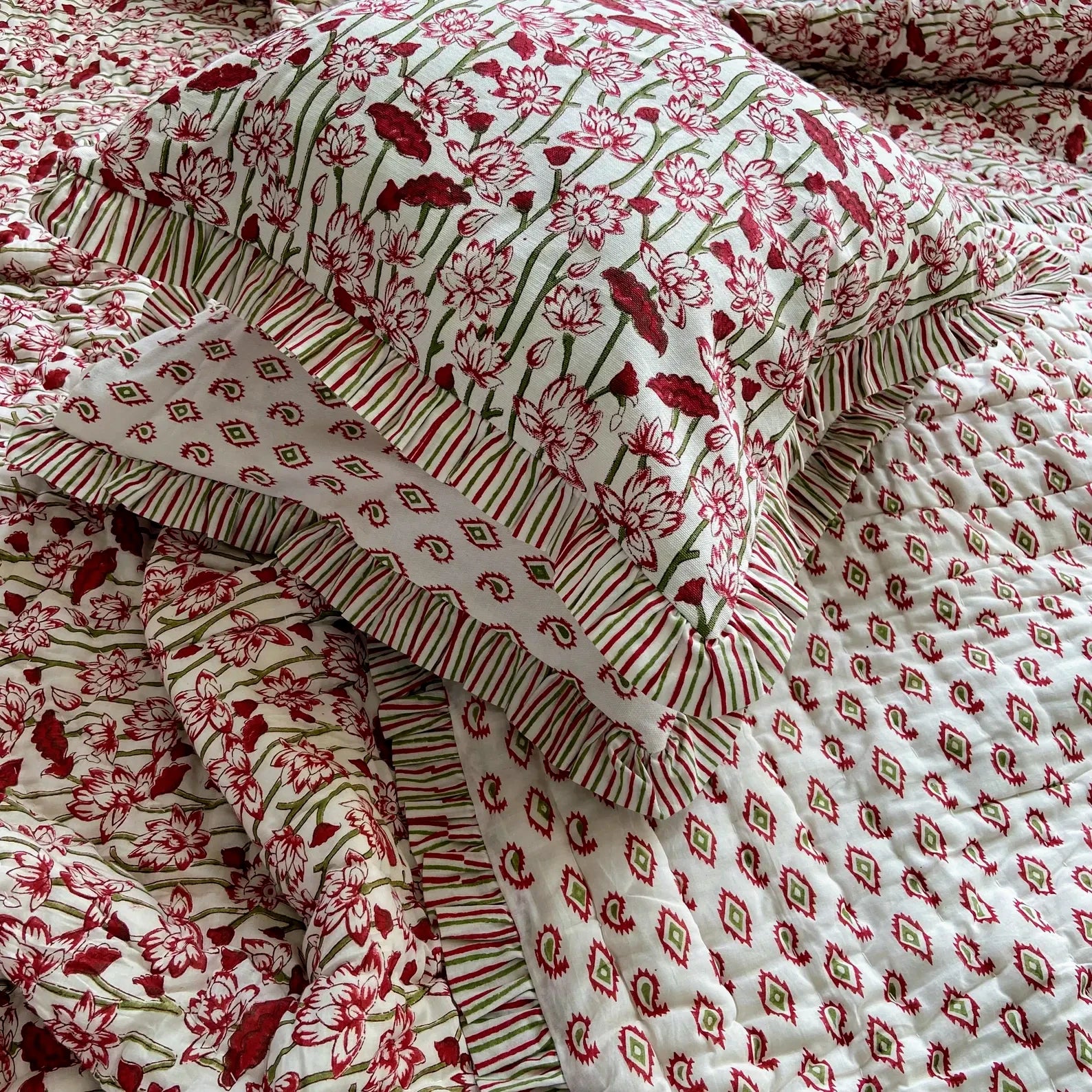 Handcrafted using traditional Indian block printing, this vintage-inspired cotton quilt is made from lightweight cotton voile and quilted entirely by hand with 100% cotton filling. Featuring a timeless floral print and a reversible design, this piece is soft, breathable, and perfect for year-round layering.